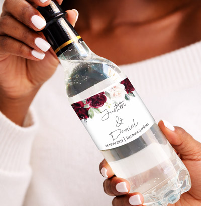 We design custom wedding water labels that match your wedding theme and bottle style.
